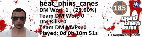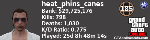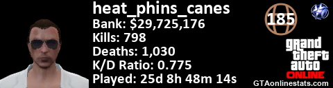 [URL=http://GTAonlinestats.com/showplayer/heat_phins_canes][IMG]http://GTAonlinestats.com/signature/heat_phins_canes/sig.png[/IMG][/URL]