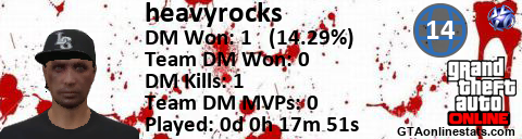 [URL=http://GTAonlinestats.com/showplayer/heavyrocks][IMG]http://GTAonlinestats.com/dmsignature/heavyrocks/sig.png[/IMG][/URL]
