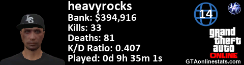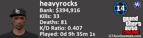 [URL=http://GTAonlinestats.com/showplayer/heavyrocks][IMG]http://GTAonlinestats.com/signature/heavyrocks/sig.png[/IMG][/URL]