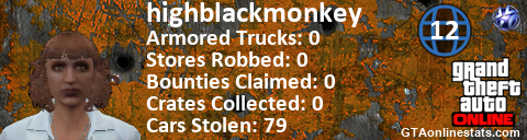 [URL=http://GTAonlinestats.com/showplayer/highblackmonkey/2][IMG]http://GTAonlinestats.com/crimesignature/highblackmonkey/2/sig.png[/IMG][/URL]