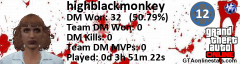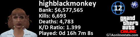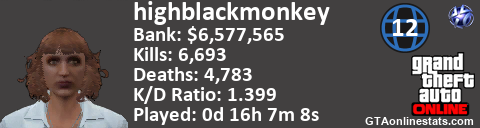 [URL=http://GTAonlinestats.com/showplayer/highblackmonkey/2][IMG]http://GTAonlinestats.com/dmsignature/highblackmonkey/2/sig.png[/IMG][/URL]