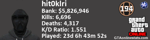 <a href="http://GTAonlinestats.com/showplayer/hit0klri"><img src="http://GTAonlinestats.com/dmsignature/hit0klri/sig.png" alt="Hit0klri" border="0" /></a>
