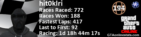 <a href="http://GTAonlinestats.com/showplayer/hit0klri"><img src="http://GTAonlinestats.com/racesignature/hit0klri/sig.png" alt="Hit0klri" border="0" /></a>