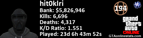 <a href="http://GTAonlinestats.com/showplayer/hit0klri"><img src="http://GTAonlinestats.com/signature/hit0klri/sig.png" alt="Hit0klri" border="0" /></a>