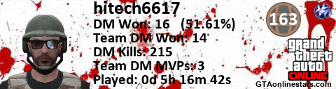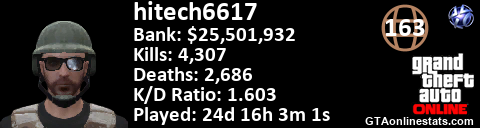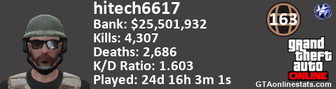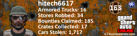 <a href="http://GTAonlinestats.com/showplayer/hitech6617"><img src="http://GTAonlinestats.com/randomsignature/hitech6617/sig.png" alt="hitech6617" border="0" /></a>
