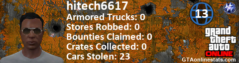[URL=http://GTAonlinestats.com/showplayer/hitech6617/2][IMG]http://GTAonlinestats.com/crimesignature/hitech6617/2/sig.png[/IMG][/URL]