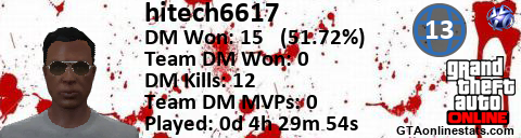 [URL=http://GTAonlinestats.com/showplayer/hitech6617/2][IMG]http://GTAonlinestats.com/dmsignature/hitech6617/2/sig.png[/IMG][/URL]