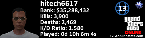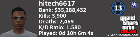 <a href="http://GTAonlinestats.com/showplayer/hitech6617/2"><img src="http://GTAonlinestats.com/randomsignature/hitech6617/2/sig.png" alt="hitech6617" border="0" /></a>