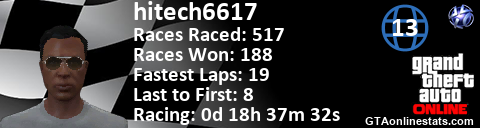 [URL=http://GTAonlinestats.com/showplayer/hitech6617/2][IMG]http://GTAonlinestats.com/racesignature/hitech6617/2/sig.png[/IMG][/URL]