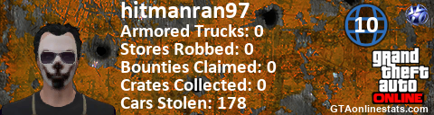 [URL=http://GTAonlinestats.com/showplayer/hitmanran97/2][IMG]http://GTAonlinestats.com/crimesignature/hitmanran97/2/sig.png[/IMG][/URL]