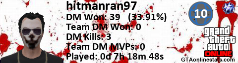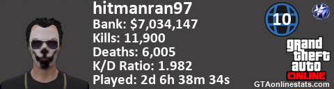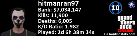 [URL=http://GTAonlinestats.com/showplayer/hitmanran97/2][IMG]http://GTAonlinestats.com/dmsignature/hitmanran97/2/sig.png[/IMG][/URL]