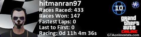 <a href="http://GTAonlinestats.com/showplayer/hitmanran97/2"><img src="http://GTAonlinestats.com/racesignature/hitmanran97/2/sig.png" alt="hitmanran97" border="0" /></a>