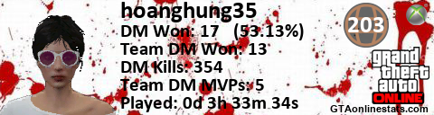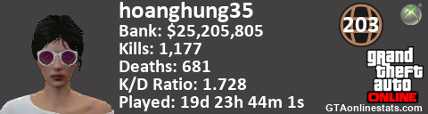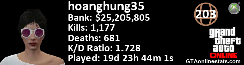 <a href="http://GTAonlinestats.com/showplayer/hoanghung35/2"><img src="http://GTAonlinestats.com/dmsignature/hoanghung35/2/sig.png" alt="hoanghung35" border="0" /></a>