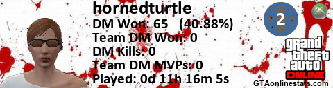 [URL=http://GTAonlinestats.com/showplayer/hornedturtle/2][IMG]http://GTAonlinestats.com/dmsignature/hornedturtle/2/sig.png[/IMG][/URL]