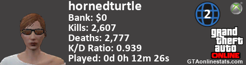 [URL=http://GTAonlinestats.com/showplayer/hornedturtle/2][IMG]http://GTAonlinestats.com/signature/hornedturtle/2/sig.png[/IMG][/URL]
