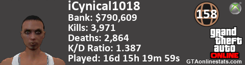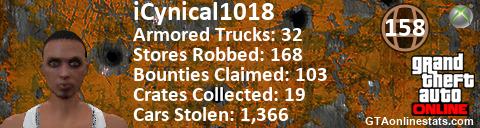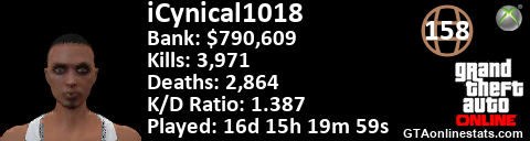 [URL=http://GTAonlinestats.com/showplayer/iCynical1018][IMG]http://GTAonlinestats.com/randomsignature/iCynical1018/sig.png[/IMG][/URL]