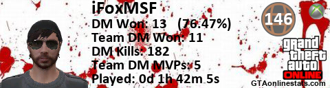 <a href="http://GTAonlinestats.com/showplayer/iFoxMSF"><img src="http://GTAonlinestats.com/dmsignature/iFoxMSF/sig.png" alt="iFoxMSF" border="0" /></a>