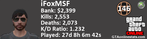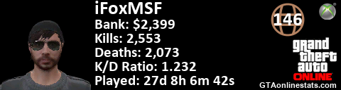 <a href="http://GTAonlinestats.com/showplayer/iFoxMSF"><img src="http://GTAonlinestats.com/signature/iFoxMSF/sig.png" alt="iFoxMSF" border="0" /></a>