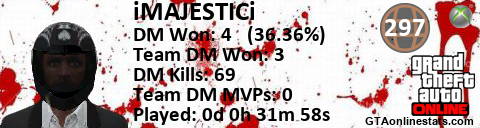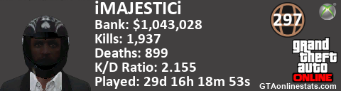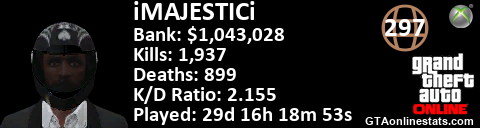 [URL=http://GTAonlinestats.com/showplayer/iMAJESTICi][IMG]http://GTAonlinestats.com/dmsignature/iMAJESTICi/sig.png[/IMG][/URL]