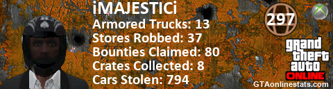 [URL=http://GTAonlinestats.com/showplayer/iMAJESTICi][IMG]http://GTAonlinestats.com/crimesignature/iMAJESTICi/sig.png[/IMG][/URL]