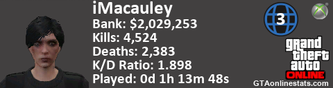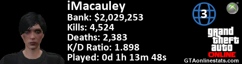 <a href="http://GTAonlinestats.com/showplayer/iMacauley/2"><img src="http://GTAonlinestats.com/signature/iMacauley/2/sig.png" alt="iMacauley" border="0" /></a>