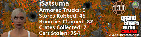 [URL=http://GTAonlinestats.com/showplayer/iSatsuma][IMG]http://GTAonlinestats.com/crimesignature/iSatsuma/sig.png[/IMG][/URL]