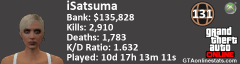 [URL=http://GTAonlinestats.com/showplayer/iSatsuma][IMG]http://GTAonlinestats.com/signature/iSatsuma/sig.png[/IMG][/URL]