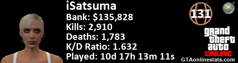<a href="http://GTAonlinestats.com/showplayer/iSatsuma"><img src="http://GTAonlinestats.com/signature/iSatsuma/sig.png" alt="iSatsuma" border="0" /></a>