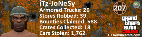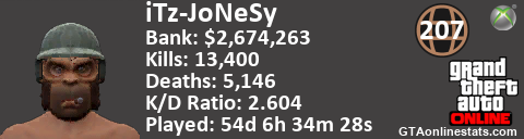 [URL=http://GTAonlinestats.com/showplayer/iTz-JoNeSy][IMG]http://GTAonlinestats.com/signature/iTz-JoNeSy/sig.png[/IMG][/URL]