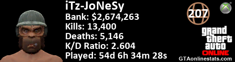 <a href="http://GTAonlinestats.com/showplayer/iTz-JoNeSy"><img src="http://GTAonlinestats.com/signature/iTz-JoNeSy/sig.png" alt="iTz-JoNeSy" border="0" /></a>