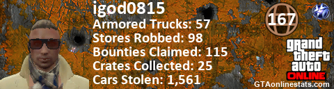 [URL=http://GTAonlinestats.com/showplayer/igod0815][IMG]http://GTAonlinestats.com/crimesignature/igod0815/sig.png[/IMG][/URL]