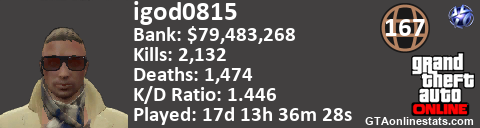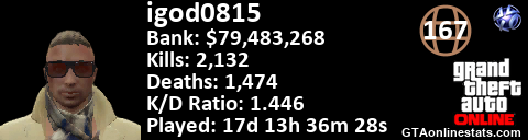 [URL=http://GTAonlinestats.com/showplayer/igod0815][IMG]http://GTAonlinestats.com/signature/igod0815/sig.png[/IMG][/URL]