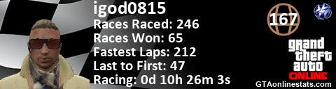 [URL=http://GTAonlinestats.com/showplayer/igod0815][IMG]http://GTAonlinestats.com/racesignature/igod0815/sig.png[/IMG][/URL]