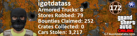 [URL=http://GTAonlinestats.com/showplayer/igotdatass][IMG]http://GTAonlinestats.com/crimesignature/igotdatass/sig.png[/IMG][/URL]