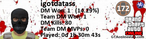[URL=http://GTAonlinestats.com/showplayer/igotdatass][IMG]http://GTAonlinestats.com/signature/igotdatass/sig.png[/IMG][/URL]