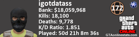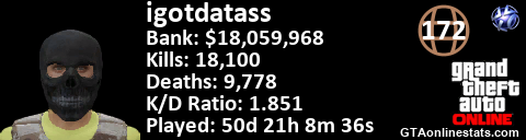 [URL=http://GTAonlinestats.com/showplayer/igotdatass][IMG]http://GTAonlinestats.com/dmsignature/igotdatass/sig.png[/IMG][/URL]