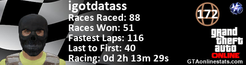 [URL=http://GTAonlinestats.com/showplayer/igotdatass][IMG]http://GTAonlinestats.com/racesignature/igotdatass/sig.png[/IMG][/URL]