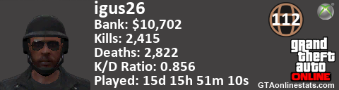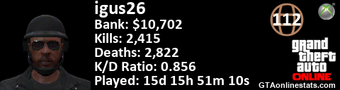 [URL=http://GTAonlinestats.com/showplayer/igus26/2][IMG]http://GTAonlinestats.com/signature/igus26/2/sig.png[/IMG][/URL]