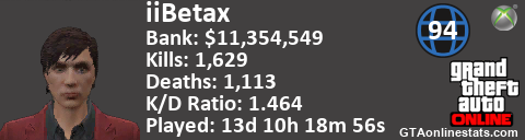[URL=http://GTAonlinestats.com/showplayer/iiBetax][IMG]http://GTAonlinestats.com/signature/iiBetax/sig.png[/IMG][/URL]
