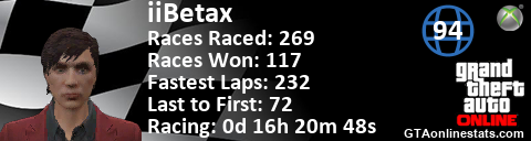 [URL=http://GTAonlinestats.com/showplayer/iiBetax][IMG]http://GTAonlinestats.com/racesignature/iiBetax/sig.png[/IMG][/URL]