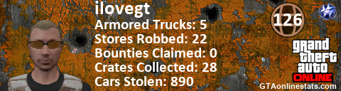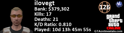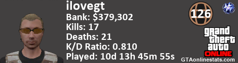 [URL=http://GTAonlinestats.com/showplayer/ilovegt][IMG]http://GTAonlinestats.com/signature/ilovegt/sig.png[/IMG][/URL]