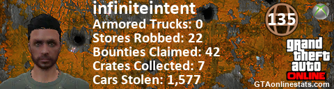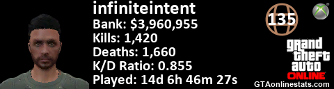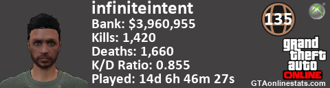 <a href="http://GTAonlinestats.com/showplayer/infiniteintent"><img src="http://GTAonlinestats.com/signature/infiniteintent/sig.png" alt="infiniteintent" border="0" /></a>
