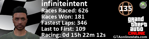 [URL=http://GTAonlinestats.com/showplayer/infiniteintent][IMG]http://GTAonlinestats.com/racesignature/infiniteintent/sig.png[/IMG][/URL]