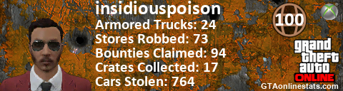 [URL=http://GTAonlinestats.com/showplayer/insidiouspoison][IMG]http://GTAonlinestats.com/crimesignature/insidiouspoison/sig.png[/IMG][/URL]