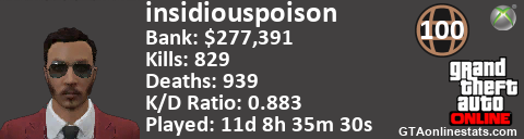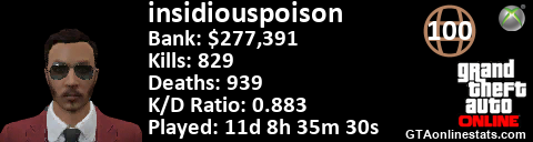 <a href="http://GTAonlinestats.com/showplayer/insidiouspoison"><img src="http://GTAonlinestats.com/dmsignature/insidiouspoison/sig.png" alt="insidiouspoison" border="0" /></a>