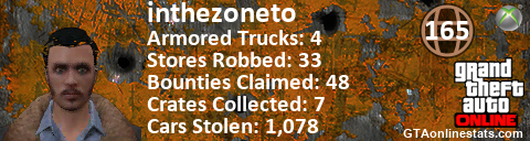 [URL=http://GTAonlinestats.com/showplayer/inthezoneto][IMG]http://GTAonlinestats.com/crimesignature/inthezoneto/sig.png[/IMG][/URL]