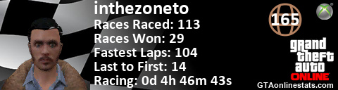 [URL=http://GTAonlinestats.com/showplayer/inthezoneto][IMG]http://GTAonlinestats.com/racesignature/inthezoneto/sig.png[/IMG][/URL]