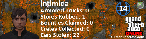 [URL=http://GTAonlinestats.com/showplayer/intimida/2][IMG]http://GTAonlinestats.com/crimesignature/intimida/2/sig.png[/IMG][/URL]