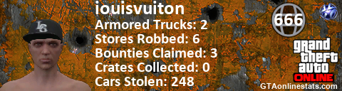 <a href="http://GTAonlinestats.com/showplayer/iouisvuiton"><img src="http://GTAonlinestats.com/crimesignature/iouisvuiton/sig.png" alt="Iouisvuiton" border="0" /></a>