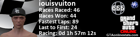 [URL=http://GTAonlinestats.com/showplayer/iouisvuiton][IMG]http://GTAonlinestats.com/racesignature/iouisvuiton/sig.png[/IMG][/URL]